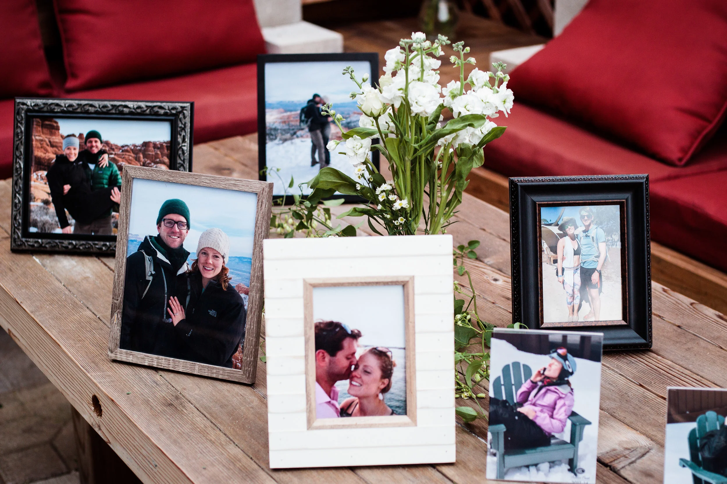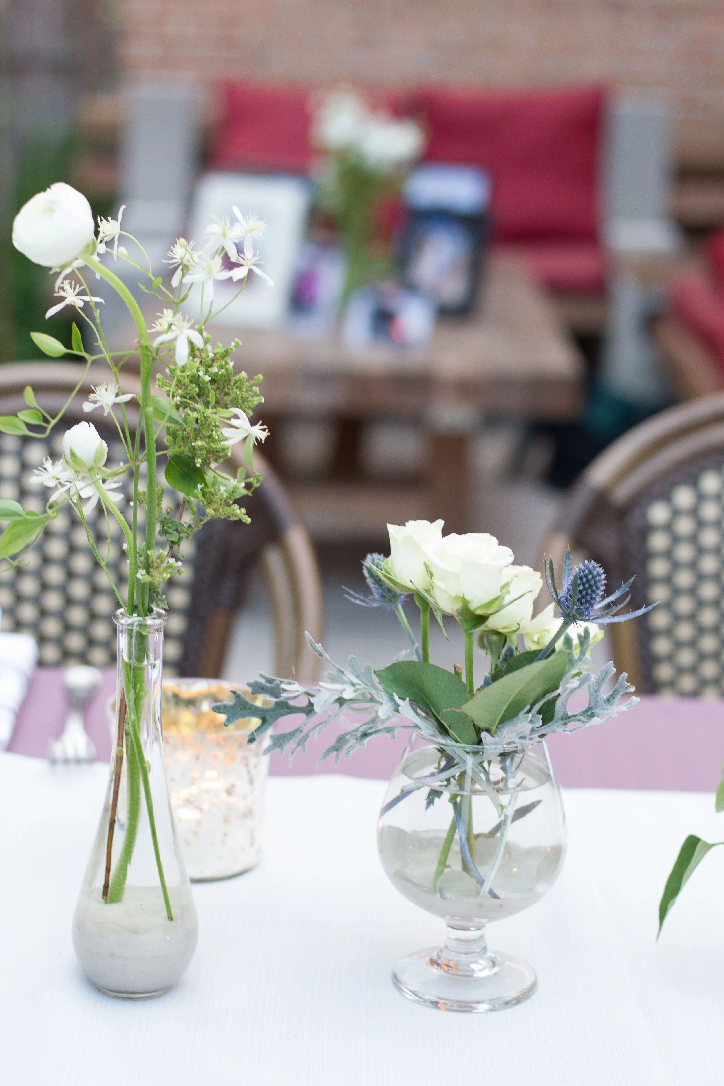 For Becky and Matt’s rehearsal, it was hosted by Matt’s parents, who called me asking for some help. They lived in Los Angeles and needed help from a distance to get everything set up. They had seen the restaurant once when they were in town but given the time change and how much they wanted to spend time with family they just wanted some help. We worked with Matt and his parents to pull in colors that were being used that the wedding but create an al fresco dining experience reminiscent of California. We set the table up to make two long guest table so many people could connect. His parents brought in pictures of the two of them that we placed on the coffee table in the lounge area. Along the length of the tables a florist set a variety of bud vases with locally grown ivory and cream blooms and each place setting had the evening menu topped with the coupled custom seal.