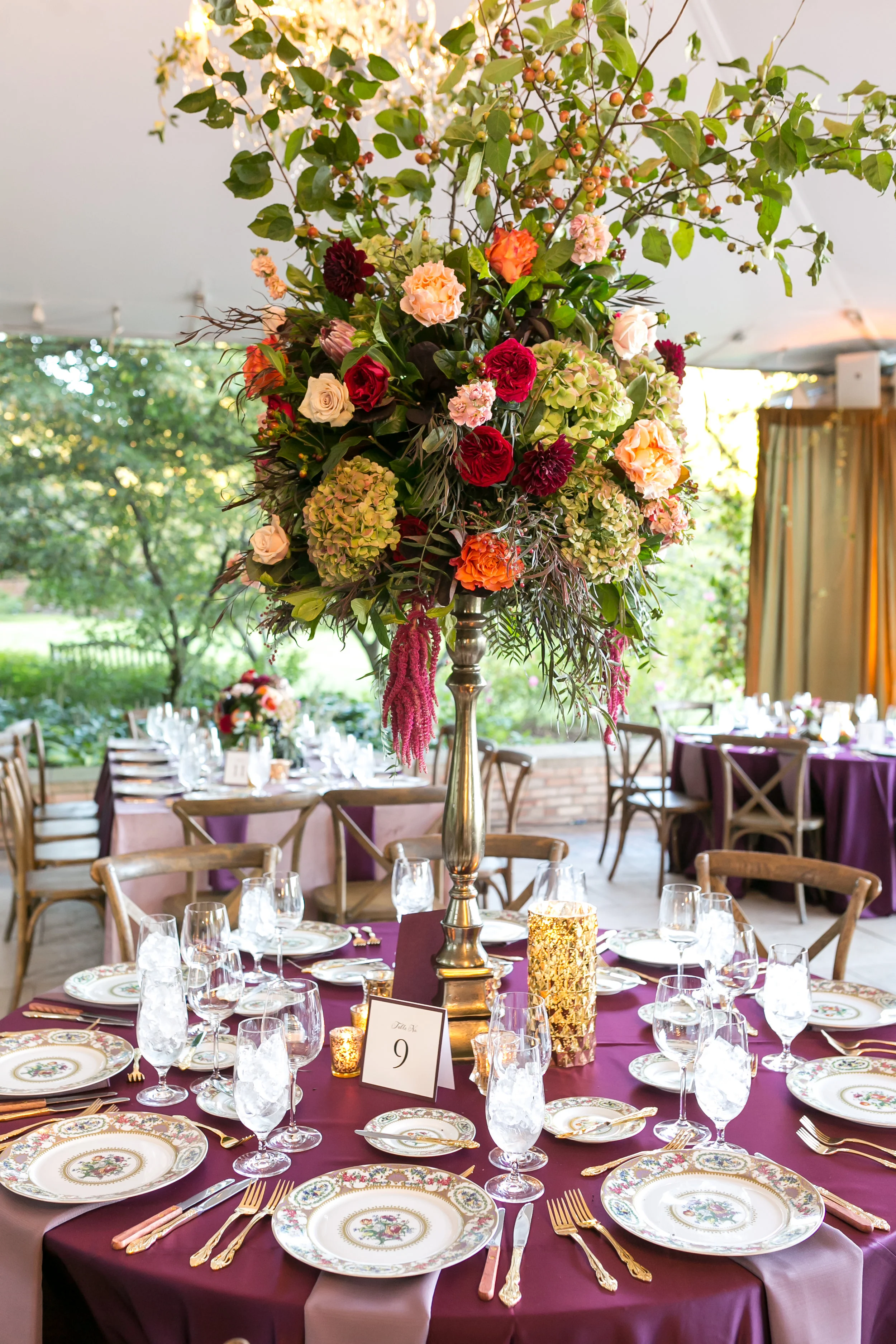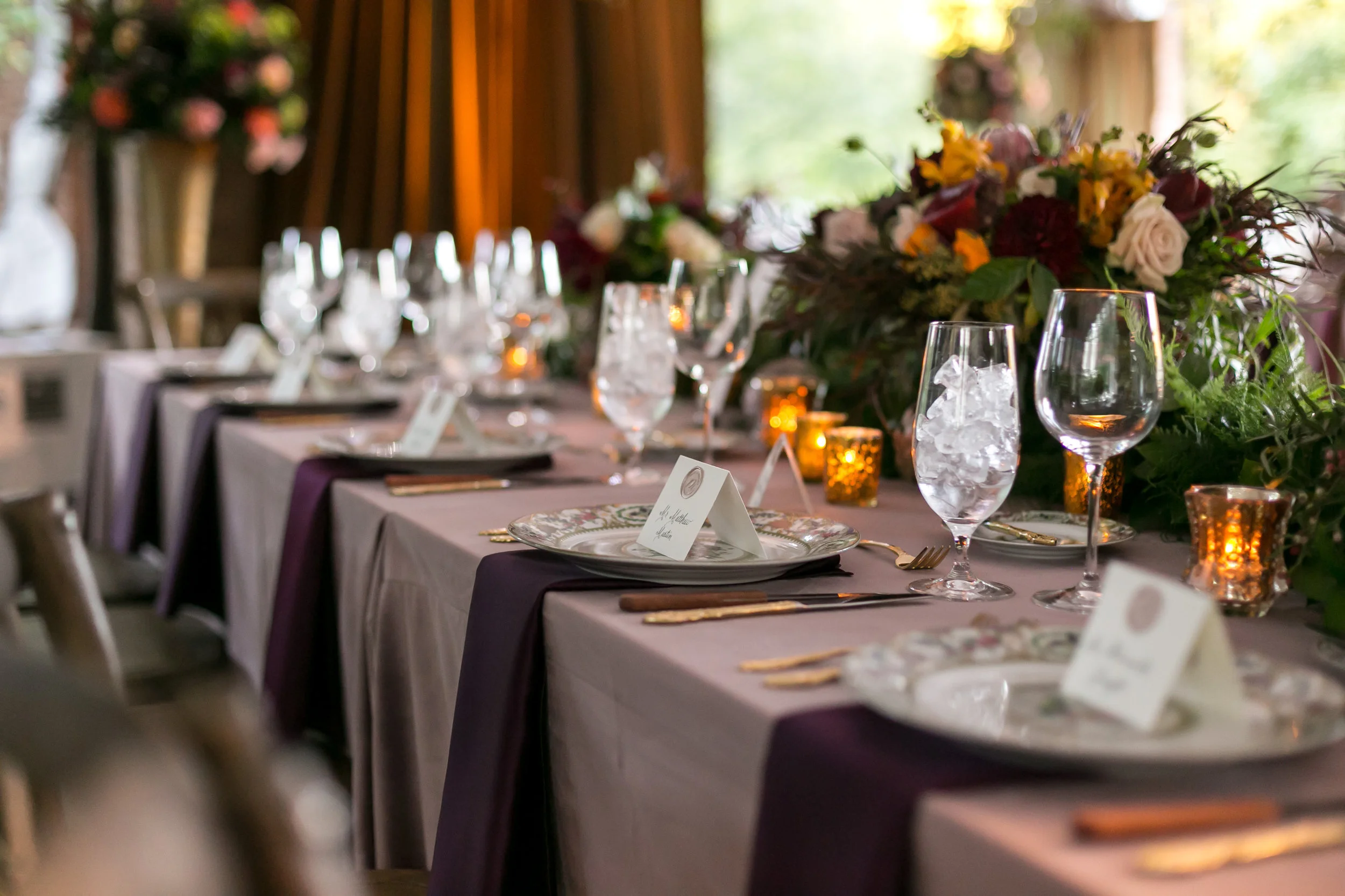 Sometimes we assume that a natural design equals a neutral color scheme, but Matthew and Rebecca did not shy away from color! They kept things interesting by playing with vibrant fall hues adding a baroque twist with the place settings. The addition of fruit and vegetables to their flower arrangements was another subtle nod to nature and their love of food.
