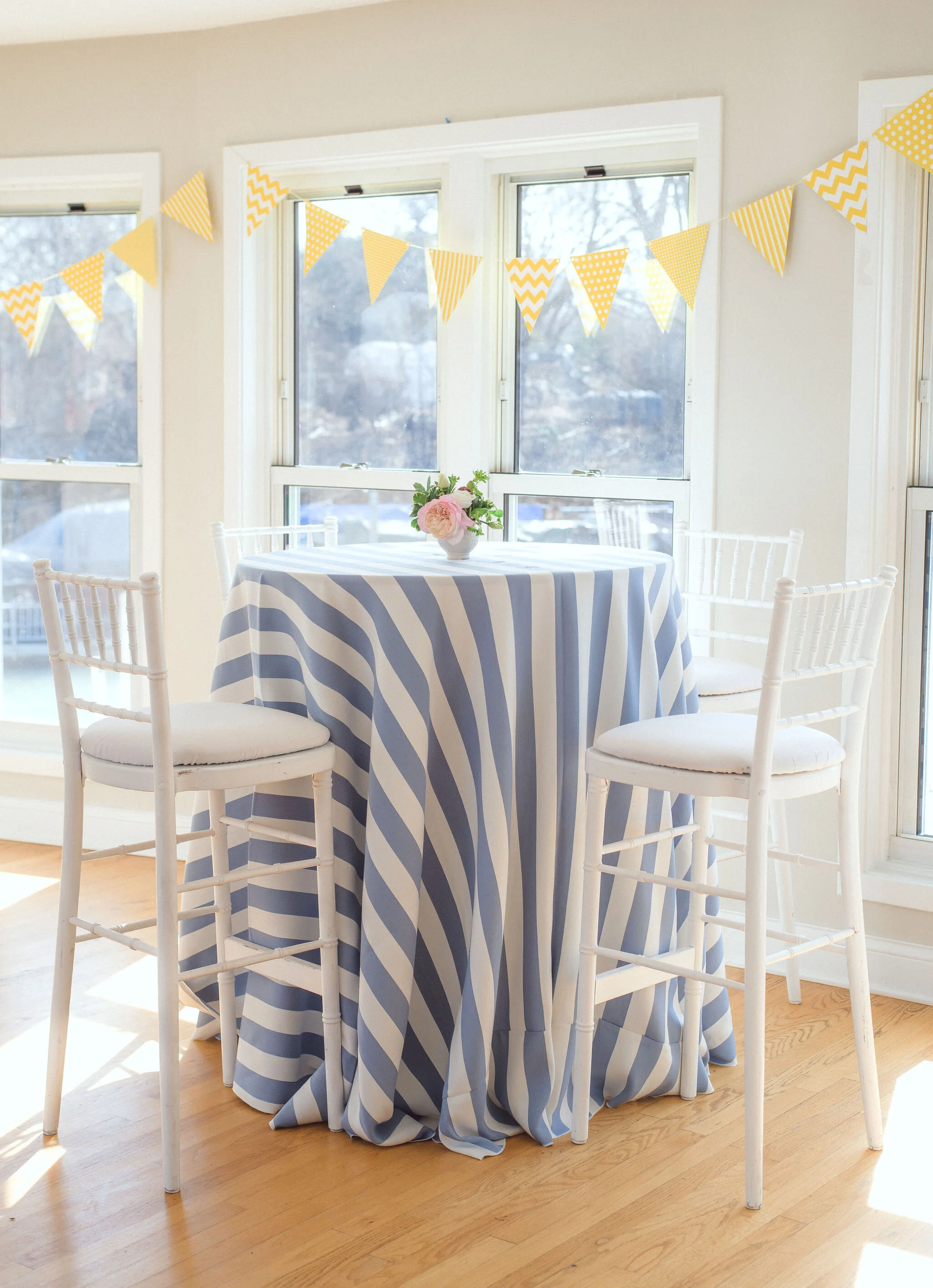 Wilmette Harbor Club has a great view of Lake Michigan, and all the natural light creates a bright and airy feeling. The design allowed the natural elements of the space to shine. There were clusters of balloons that looked like puffy clouds, cute paper planes scattered around the tables, some simple florals, and fun patterned linens to keep things whimsical.